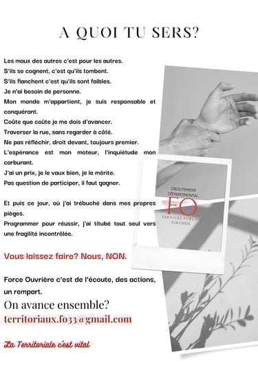 Vous aurez toujours une attention, une écoute attentive avec un regard lucide sur votre situation.Même si dans votre collectivité il n'existe pas (encore) de syndicat FO nous avons une structure avec une interlocutrice dédiée pour chaque agent désireux d'obtenir des renseignements, une information, une pertinence d'approche.